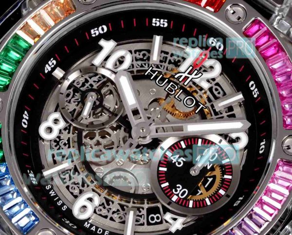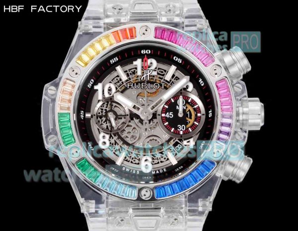 Swiss Grade 1 Replica HBF Hublot Big Bang Unico Sapphire Skeleton Dial Rainbow Diamond Watch