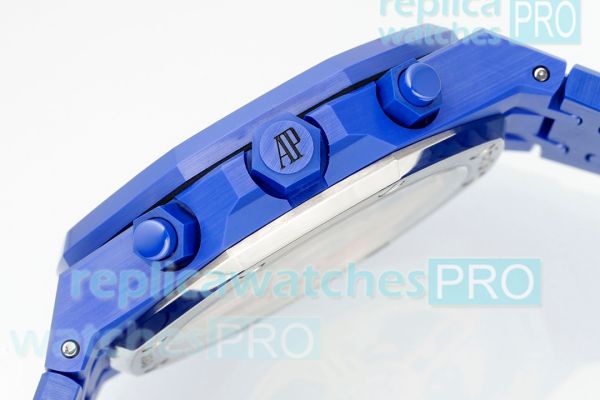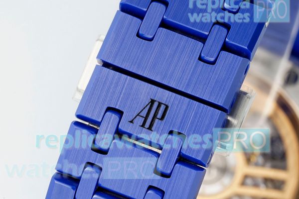 Strap: Blue coated 316L Stainless Steel Watch Band with Audemars Piguet Logo on Buckle