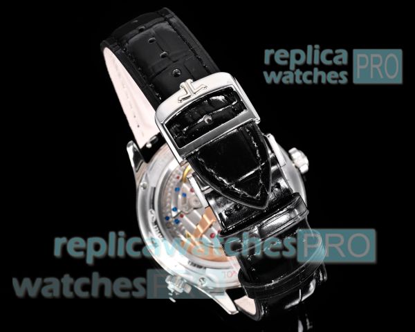 Strap: Swiss Quality Black Leather Strap with Jaeger-LeCoultre Stamped Markings on Strap and Clasp